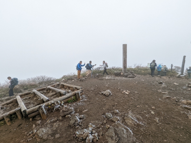 9:20 登山開始から80分で山頂に到着。予想はしておりましたが、ガスっており景色は全く楽しめません。それはともかく・・・