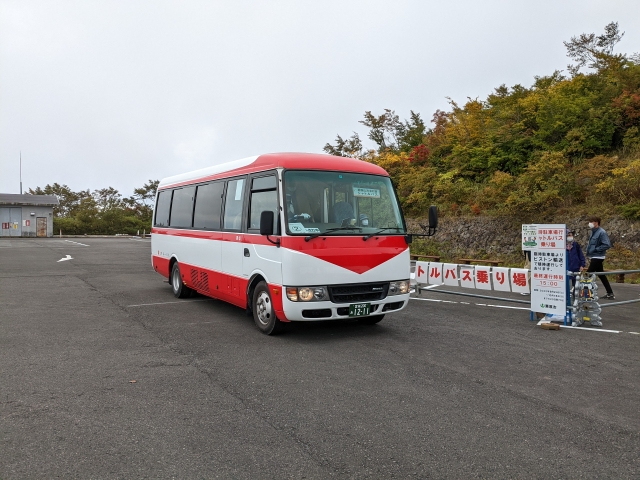マイカー利用者は、約3kmほど手前の「いこいの村栗駒跡地臨時駐車場」に車を停めてシャトルバスに乗り換える必要があります。料金は協力金として一人500円、運行時間は朝の5:00~15:30。
