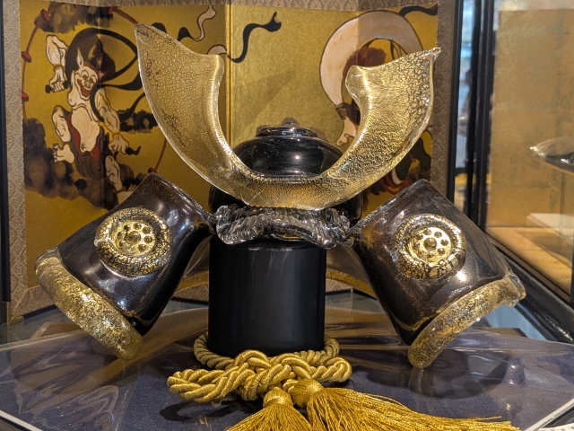 こちらはなんとガラス製の兜!角のような鍬形や、顔の左右に広がる吹返部分など、細かなところまでしっかりと再現されています。