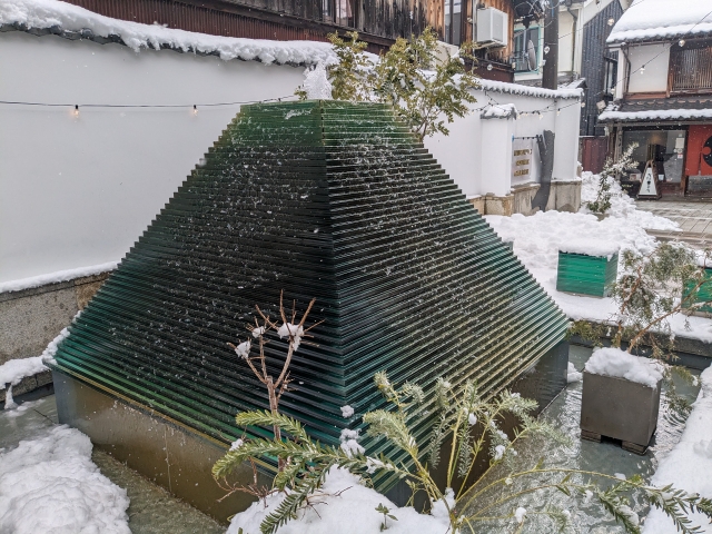 すぐそばにはガラスのピラミッドも。山頂からはこんこんと水が流れ落ちております。