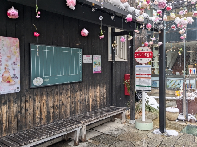 「クローバー停留所」と書かれたバス停風のポイントも。時刻表部分には、周辺ショップの徒歩所要時間が記されています。