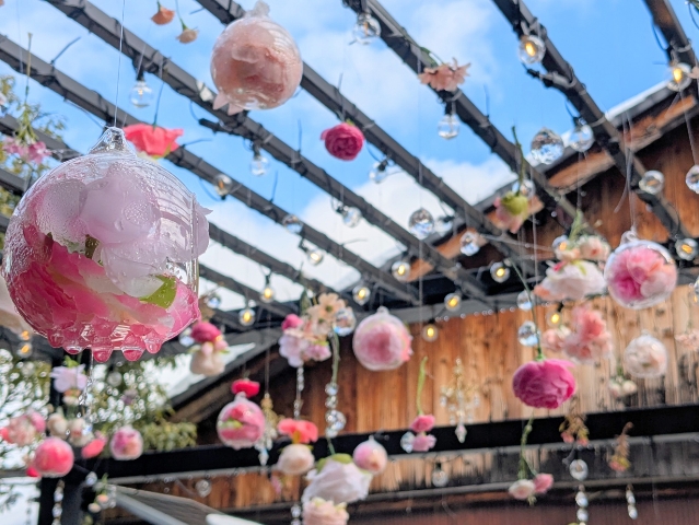 屋外に出ると、多数の風鈴が下がるフォトスポットも。ガラスと合わせて造花も添えられており、とっても華やかです。