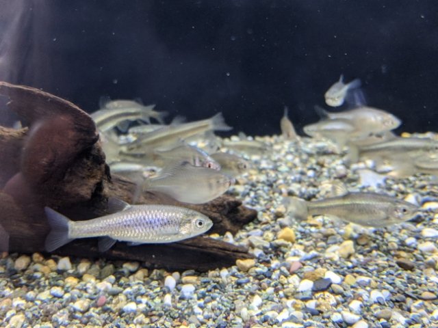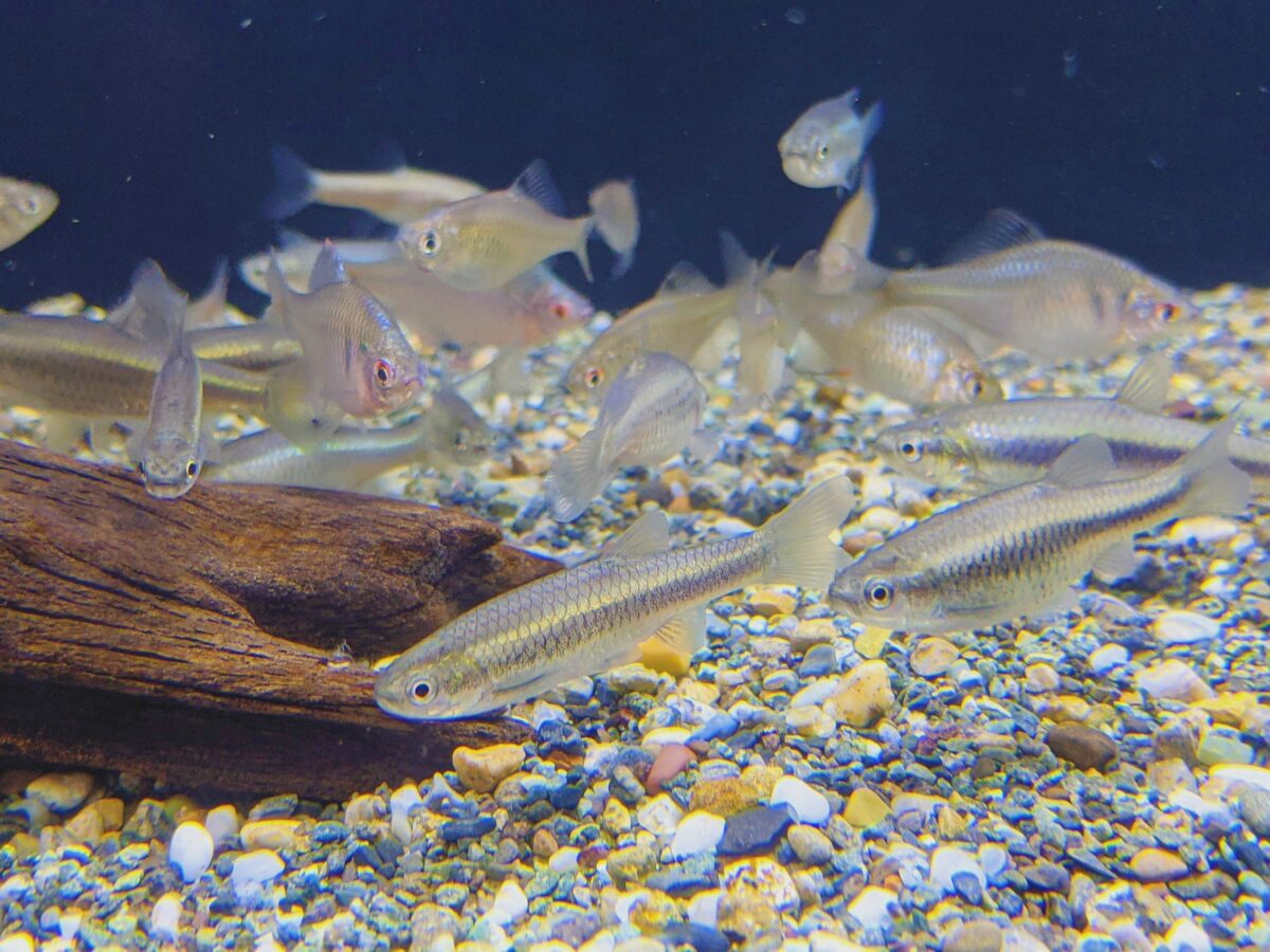 入口のゲート型水槽では、ウグイやオイカワ、カワムツ&ヌマムツが泳ぐ。いずれも上流域に暮らすサカナたちです。5月に訪問したところ、それぞれ婚姻色で色鮮やかな姿を見ることができました。