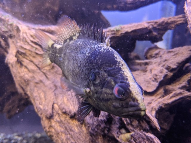 ゴツいサカナはオヤニラミ。10cmほどの大きさの小型なサカナですが気性が荒く、オイカワやムギツクなど他のサカナが近づくと睨んで追い返しています。なんだかふてぶてしい雰囲気。