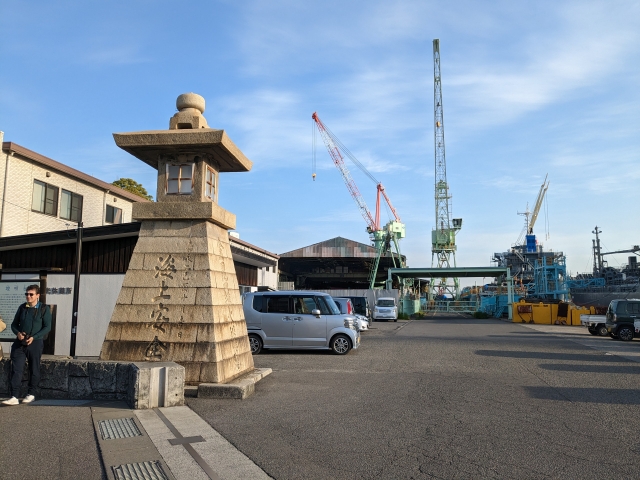 こちらが船の発着地となる波止浜港。車を停めるスペースはそこそこあります。石燈籠のようなものは、「灯明台」。海上安全を祈願したものであるそう。