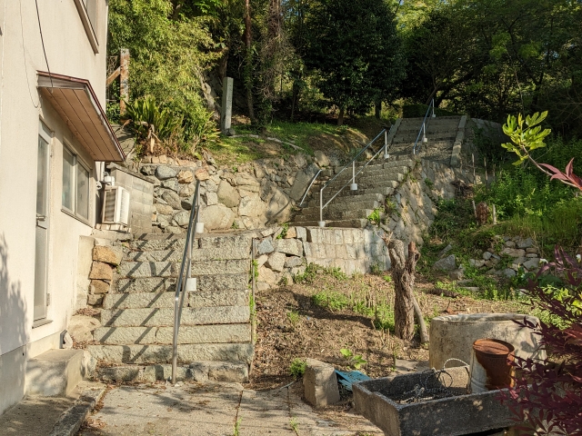 集落を進むと、石垣に設けられた石段。来島城跡の本丸へはこちらを登っていきます。