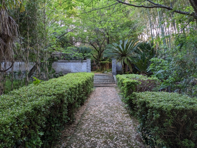 ソテツやシャラが生い茂る道。人の気配はありませんが、鳥の鳴き声と、近くの来島海峡大橋を渡る車のモーター音が聴こえてきます。