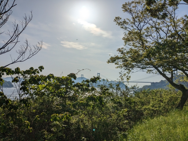 草木が生い茂っておりますが、その隙間からは車が行き交う来島海峡大橋や、造船所が並ぶ波止浜湾が見渡せます。