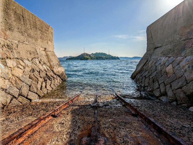 不発に終わって港へ戻る途中、海へと続くレールを発見!離島ではたまに見かける光景ですが、やっぱり写真に撮りたくなってしまいますね。