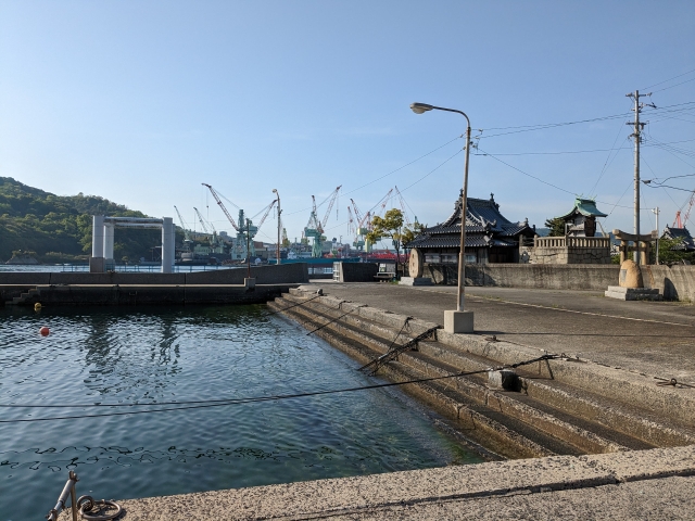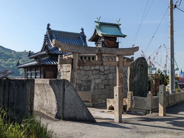 港の目の前にある八千矛神社。来島城築城とともに、守護神として建立されたものであるそう。社を支える石垣に、城郭の面影を感じます。