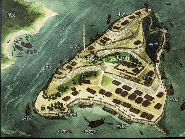 瀬戸内海の難所といわれる来島海峡に浮かんでおります。時間とともに流れを変える潮流に守られており、かつては村上水軍の根拠地であったという歴史を持ちます。