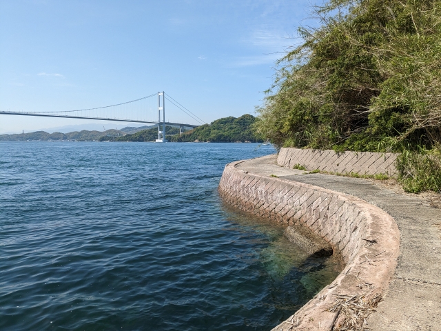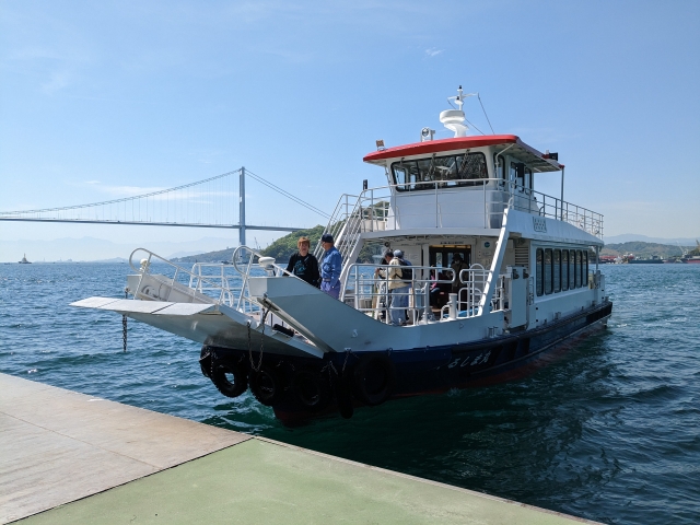 しまなみ海道周辺の離島ですが、架橋されていないため船に乗る必要があります。発着は今治市の波止浜(はしはま)港。今治駅からバスで約20分ほど、波止浜駅から歩いても20分ほどです。
