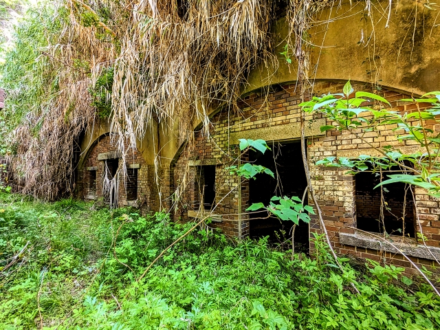 ここにも発電所跡、地下兵舎跡などが残る。先ほどの中部砲台跡に比べて植物に包まれた姿が神秘的で、ジャングルの中の遺跡のような雰囲気です。