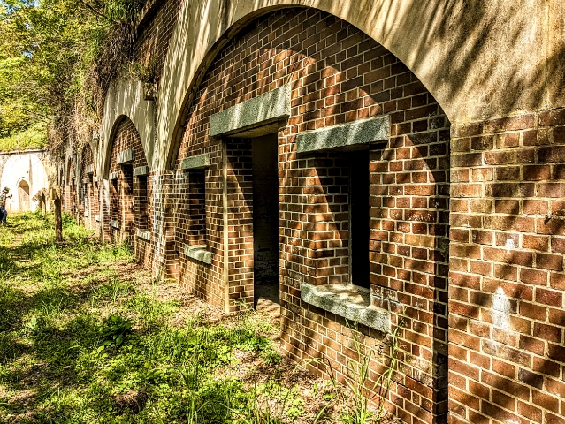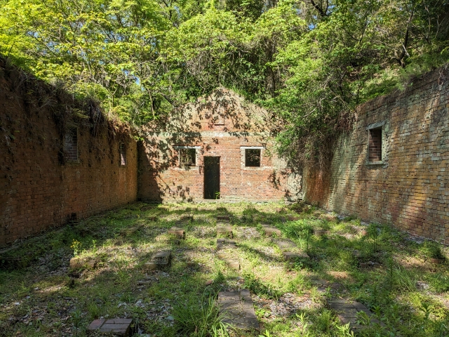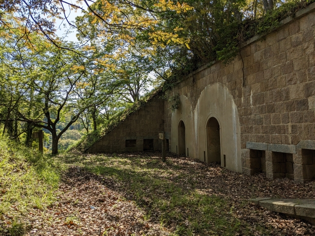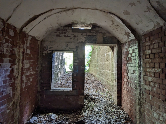 砲座以外にも、井戸や浄化装置などが残されています。地下兵舎跡のレンガ積みのアーチは、これぞ戦争遺跡といった佇まい。