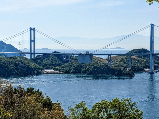 ここは見晴らしの良い展望台。目の前には来島海峡大橋や馬島の姿が見えます。波穏やかに見える海も、実は激しい潮流が流れており、交通の難所であるそう。