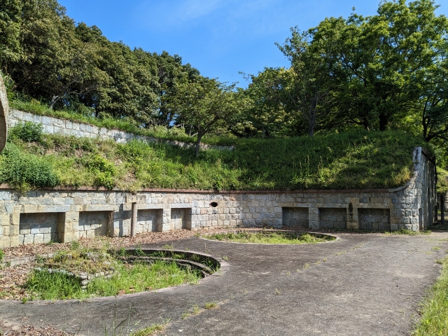 円形に作られているポイントは砲座跡。ここには12cm加農砲が2門配置されていました。