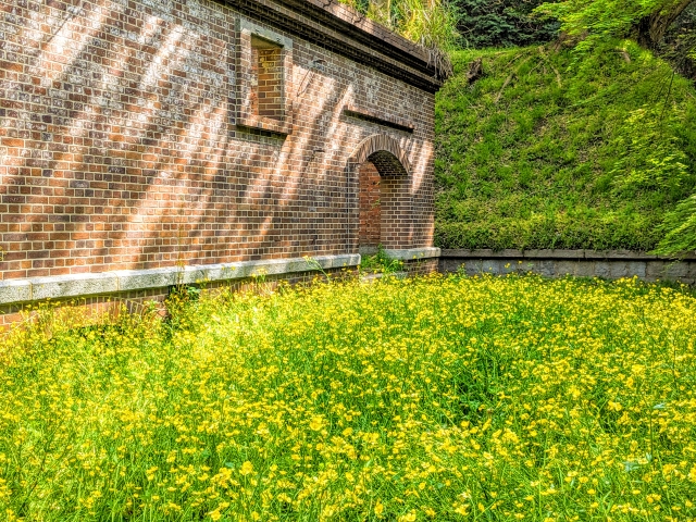 森の中にある弾薬庫跡。5月に訪問したところ、ナノハナに包まれていて素敵な姿。廃墟と花の組み合わせには、何とも言い難い魅力を感じます。