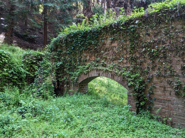 弾薬庫跡の裏手にも、もう一棟隠れています。こちらはツタに包まれて自然に溶け込んでいます。