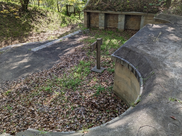 コース最後の見どころが、北部砲台跡。スロープの先には円形の砲座跡があります。