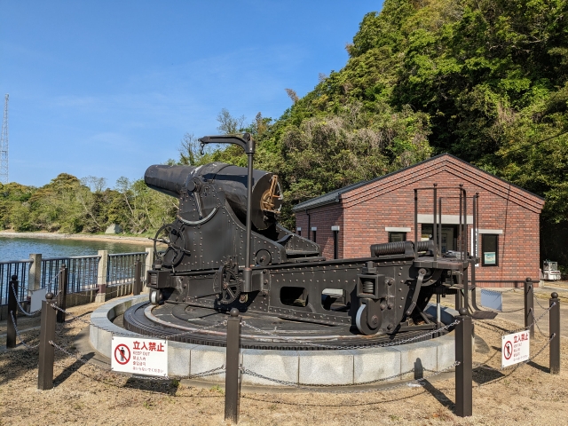 港にはトイレ付きの待合所と、28cm榴弾砲の姿が。こちらは2009年〜2011年にかけて放送されたNHKスペシャルドラマ「坂の上の雲」の撮影のために造られたレプリカであるそう。
