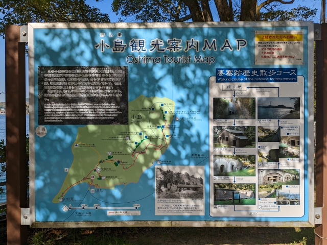 案内マップがあり、島内の戦争遺跡をめぐる散策路「要塞跡歴史散歩コース」の遊歩道がわかりやすく記されております。