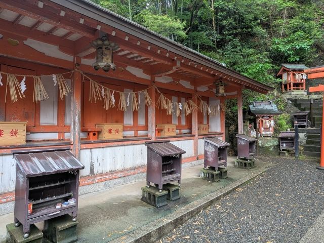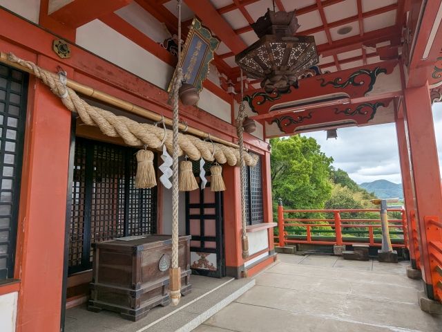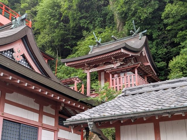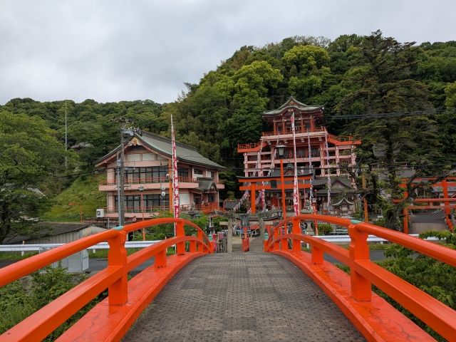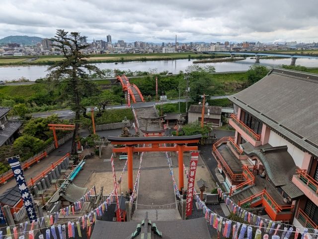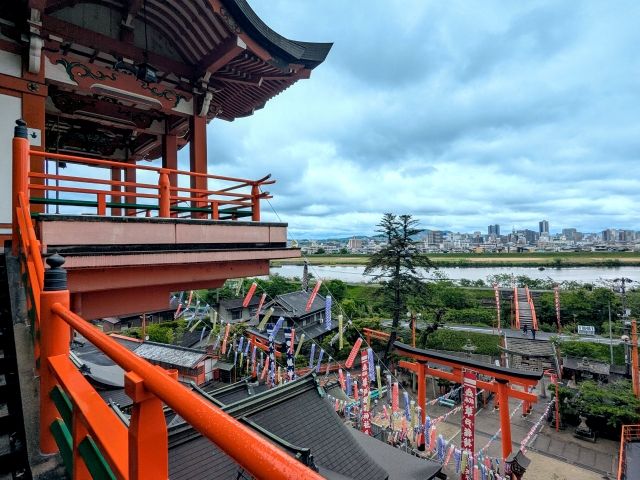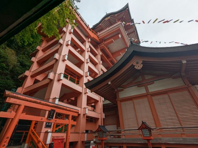 山肌にそうように高くそびえたつ社殿が特徴的な稲荷神社。 まるで懸造(かけづくり)のような建築様式に加え、せり出した舞台は開放感抜群!時間内であれば、階段を上って最上部まで行くことができます。