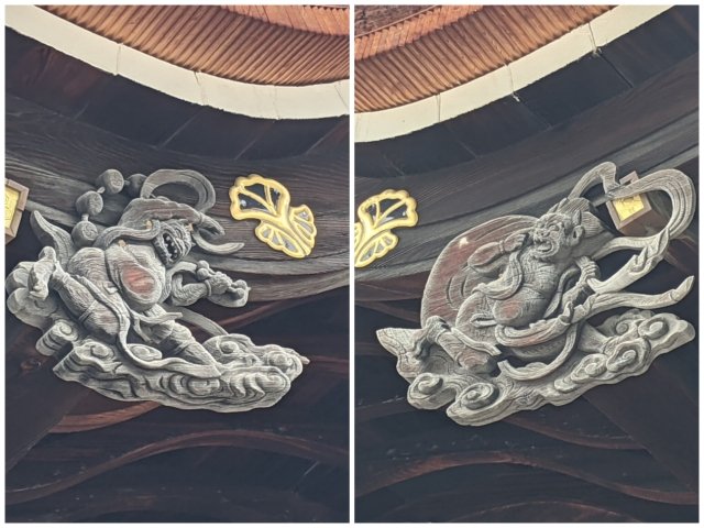 拝殿には風神雷神の彫刻が施されているのですが、よく見ると風神(写真右)があっかんべーをしています。まるで、雷神(写真左)から逃げるような仕草は、少しコミカルで楽しい気分にさせてくれます。
