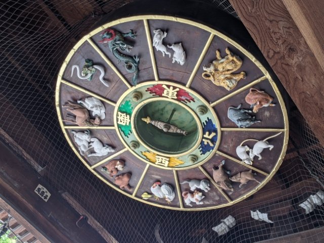 楼門で天井を見上げると、カラフルな彫刻が目に入ります。これは「干支恵方盤」。中心のコンパスが可動式となっており、今年の恵方を示しています。