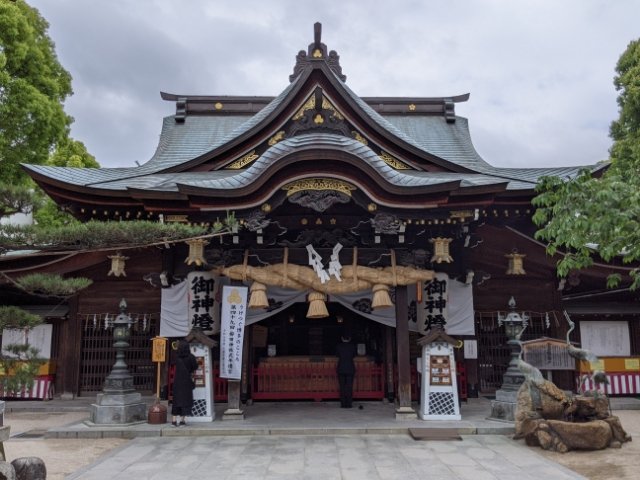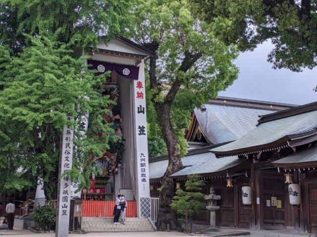 博多の総鎮守として知られる歴史ある神社。境内にはユニークな見どころも多く存在しています。例大祭である祇園山笠は全国有数の大きな祭で、それに使用される巨大な山笠の展示も一年を通して見ることができます。