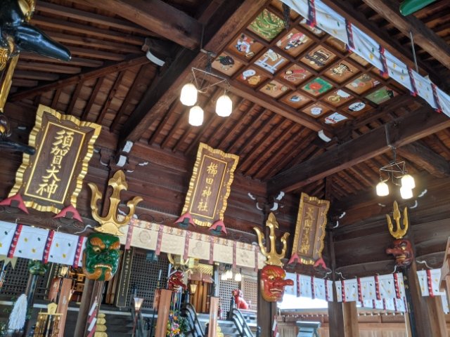 楼門をくぐると、すぐに拝殿が見えてきます。祭神は大幡大神(櫛田大神)、天照皇大神、素盞嗚大神(祇園大神)の三神。