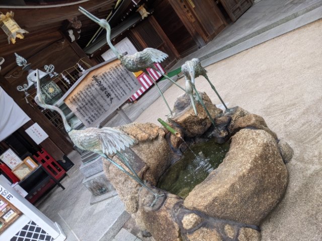 鶴が集まっているこちらの井戸は、「霊泉鶴の井戸」。この水を飲むと、不老長寿に恵まれるそう。現在は、水質の問題で飲用は中止されていますが、境内に絶え間なく流れる水の音を鳴り響かせており、何とも風流。