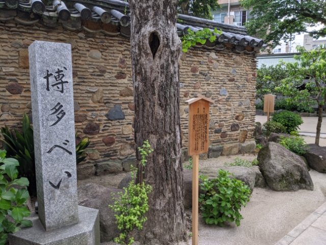 拝殿の裏手にまわると見える土壁。こちらは「博多べい」といい、かつて豊臣秀吉が築いたとされています。戦国時代の戦火によって荒廃した博多の街を復興させた秀吉。焼石や焼け瓦といった廃材を活用し、このような壁を作り上げたそうです。