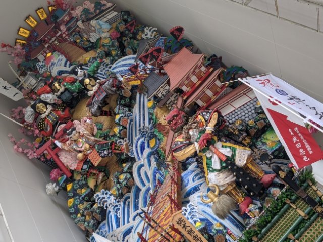 高さは10mにも及んでおり、下に立って見上げると迫力満点。飾られている人形も色鮮やかで躍動感が満ちあふれています。
