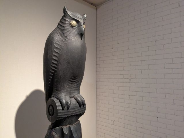 釧路生まれの芸術家による、フクロウの木彫りの作品。アイヌ語で村を守る神様という意味の名が付けられています。2mほどのダイナミックな作品ですが、腹部をよく見ると、破線のような模様も見えて繊細さも感じ取れます。