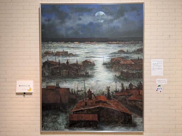 釧路を拠点に活動を続けてきた日本画家による作品。赤い建物がずらりと並び、その奥には暗い海。見守るように靄がかかった満月が浮かんでいます。赤と白と青の調和が美しく、ずっと見ていられる作品です。