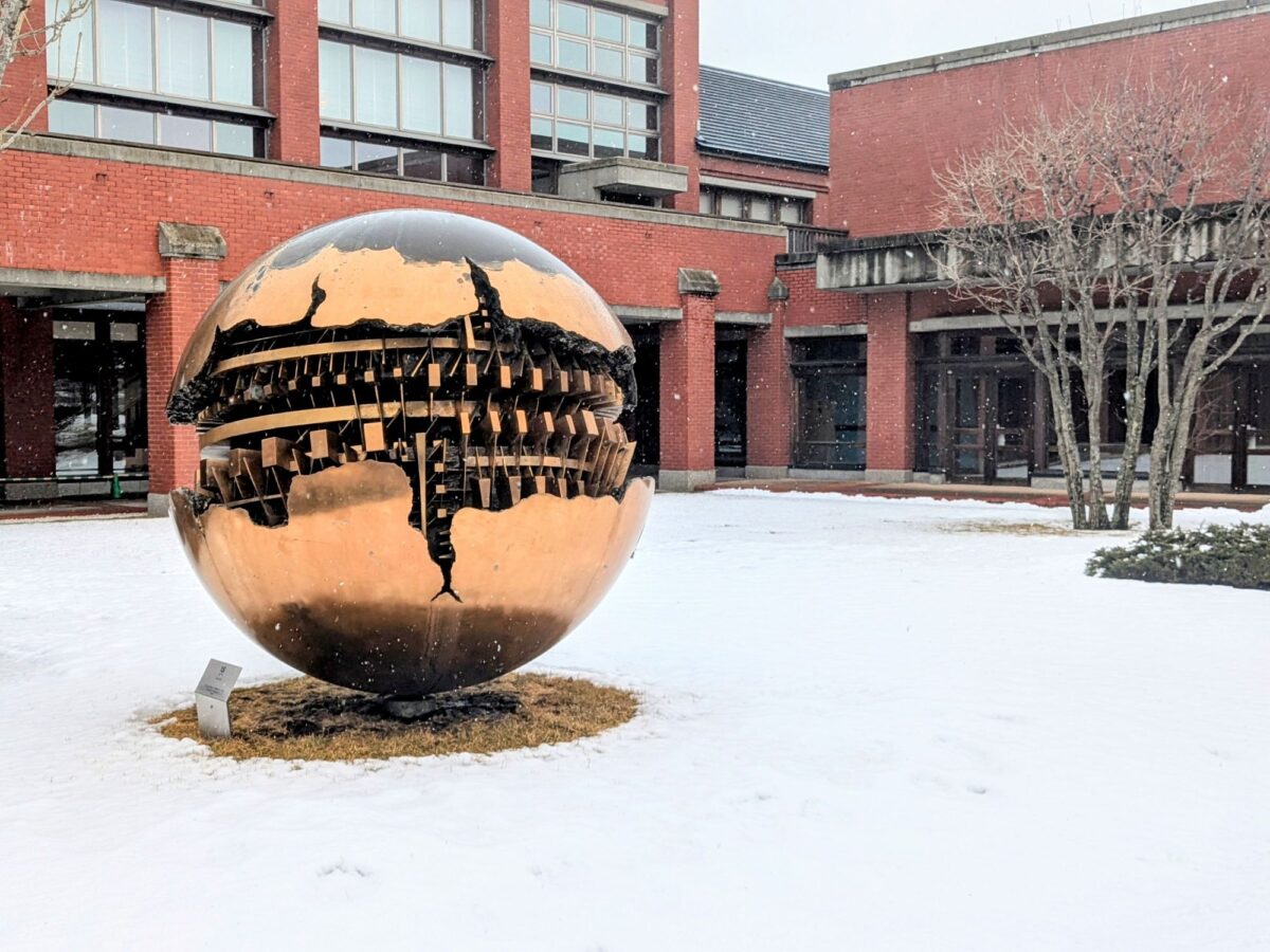 煉瓦造りの重厚な外観。入口ではアルナルド・ポモドーロ《球》が来館者を出迎えます。雪の中に佇む姿はこの季節ならではの景色。