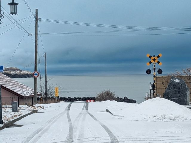 釧路埼灯台から1km弱のところには、フォトジェニックな海に向かう踏切があります。