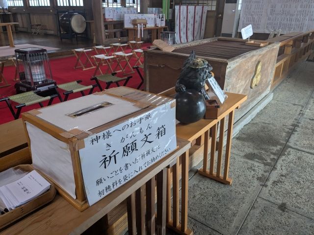 こちらは拝殿内で見かけた祈願文箱。神様への感謝と願いを書いたお手紙「祈願文」を納める場所とのこと。神様へお手紙を書くという信仰、初めて見ました。