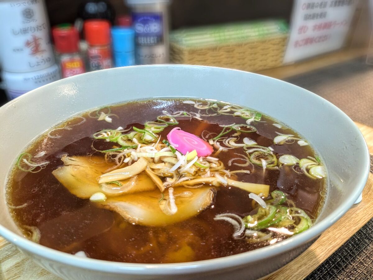 トッピングは、なると、チャーシュー、ネギ、メンマというシンプルスタイル。Xなどでよく見かける「こういうのでいいんだよ」というフレーズが頭に浮かんできました。