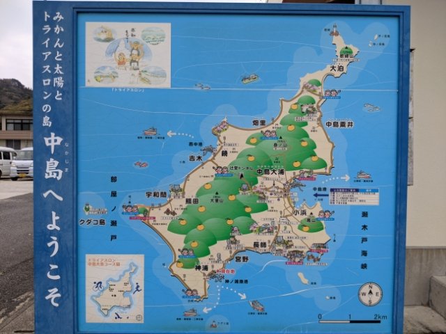 こちらが中島の観光マップ。広い島内には見どころが点在しています。そのため、徒歩でめぐるのはかなりキビシイ。