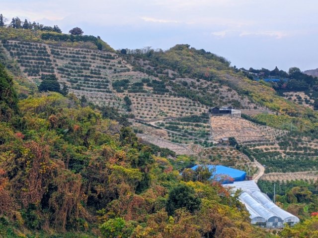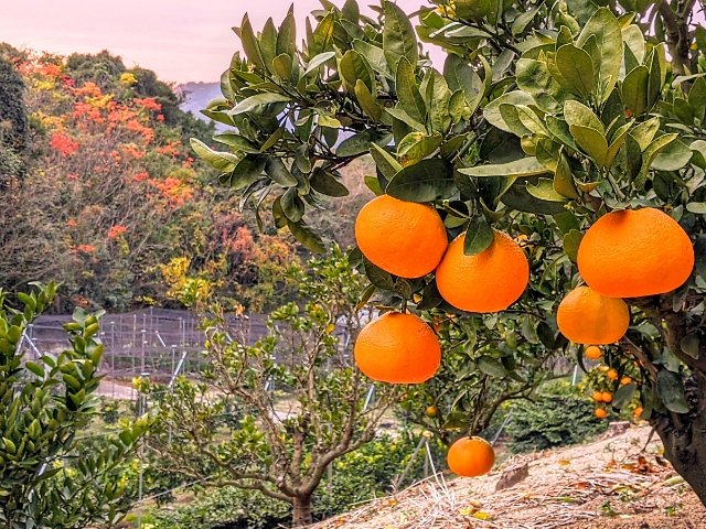 斜面に植えられたいよかん。木々に実る柑橘は色あざやかでとってもキレイ!紅葉とのコラボレーションも素敵です。