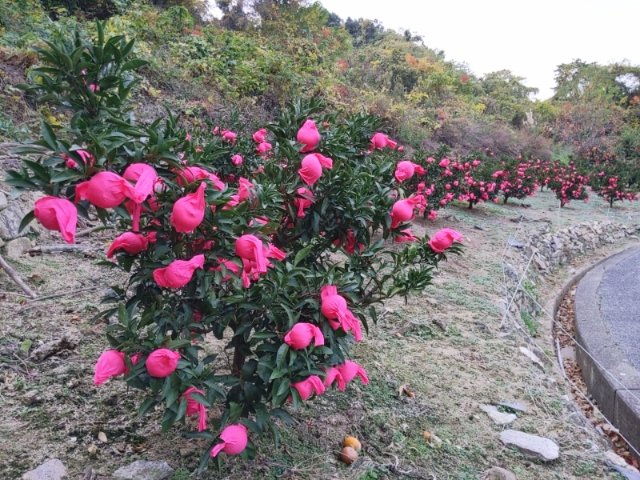 ピンク色の花に見えるのは「せとか」という品種のみかん。温度を高めたり雨水から守るためにカバーをかけて栽培しているそう。他にも、「紅まどんな」や「甘平(かんぺい)」など、様々な品種の柑橘を栽培しているそうです。