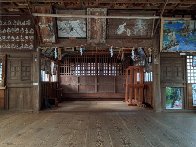 社殿の中は入れませんが、窓から覗くことはできます。様々な絵が飾られているのが印象的。さらに、格子天井にはびっしりと家紋が記されています。