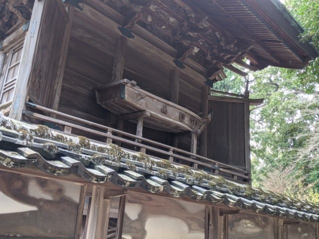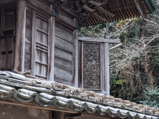 拝殿の奥には、総欅造りの立派な本殿の姿が。よく見ると、脇障子(後方に延びたついたての部分)には立派な彫刻が施されています。この彫刻は亀太郎という彫刻師と大工の長七という人物の合作で、愛媛県でも随一といわれています。