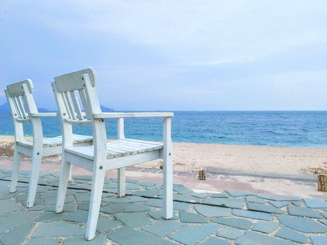 ゲストハウスやお洒落な宿泊施設がある姫ヶ浜ビーチ。海辺に並べられた白い椅子が絵になります。