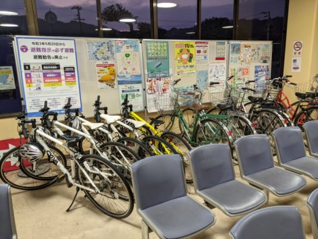 大浦港の周辺は島で一番にぎわっています。待合所にはレンタサイクルがたくさん。なんと、カゴ付きのママチャリタイプもあるようです!これまで回ってきた島はロードバイクタイプしか無かったのですが、さすがは中島です。