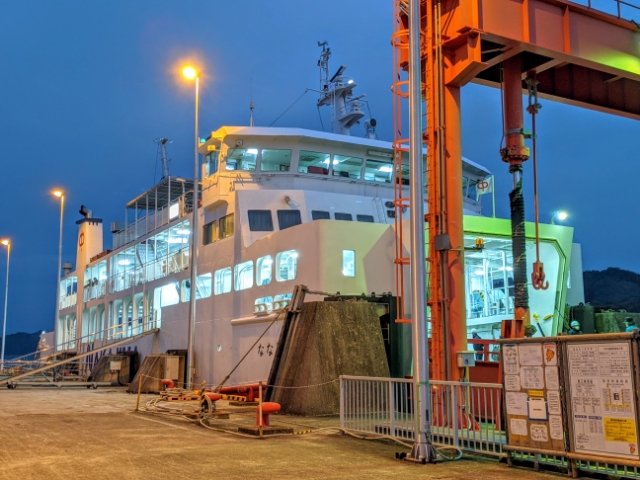 真っ暗な中で光り輝くフェリー。高浜港までは約1時間の船旅です。