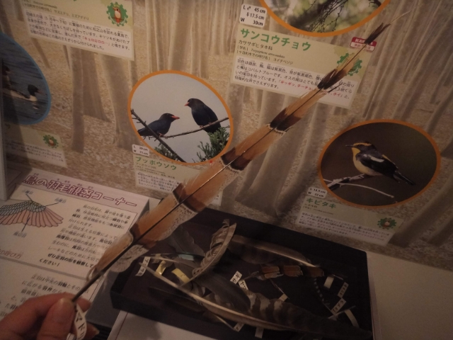 これはヤマドリの羽だ!キジのような長い尾を持つ鳥ですが、人里には姿を表さないため実際に見るのはなかなか困難。いつか生で見てみたいな~。(※実はこの数年後、隠岐にて遭遇するのですが、それはまた別の話)