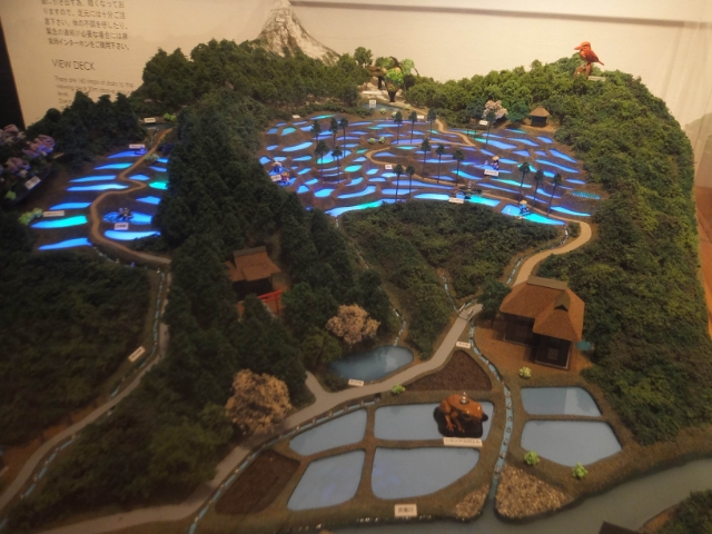 こちらは棚田ジオラマ。ボタンを押すと、里山の生き物や風習の解説が始まります。