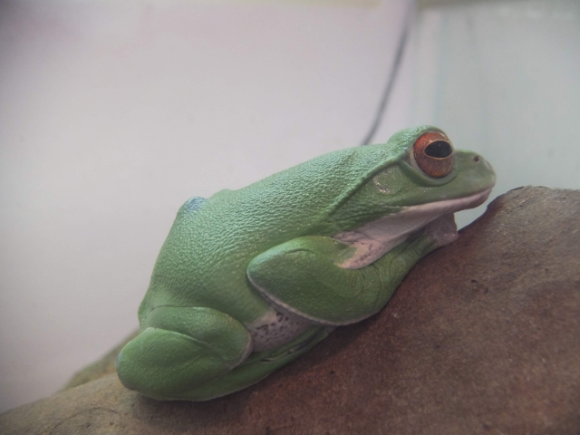 かわいいモリアオガエル。滑らかな素肌がおもちゃみたいですが、足を伸ばしたら10cmくらいありそうな大型です。